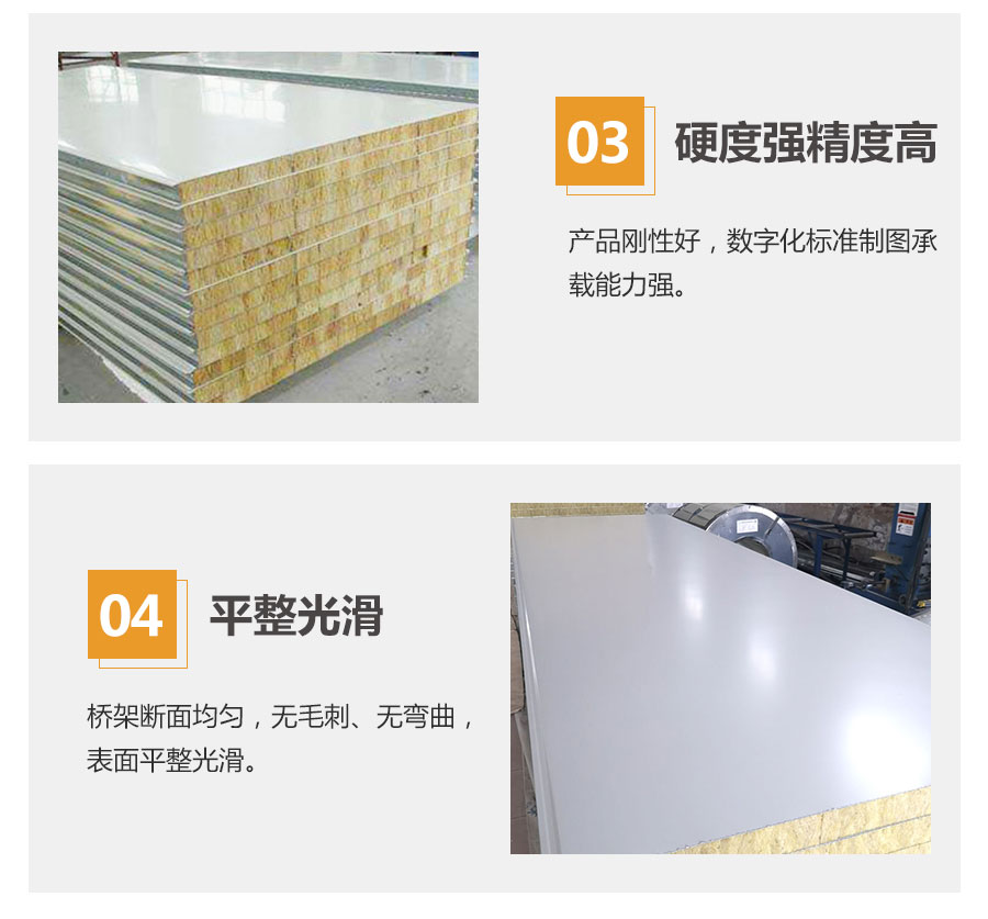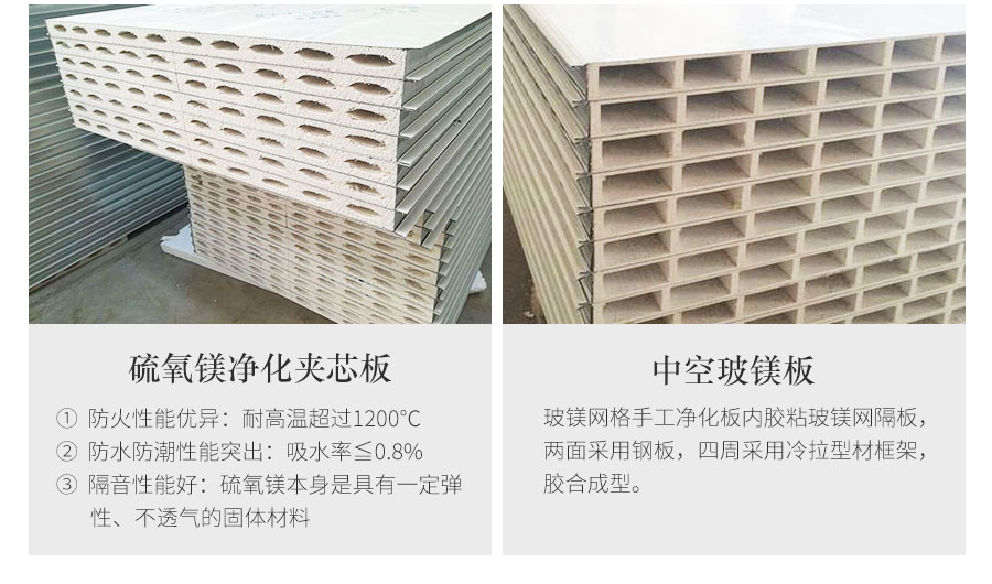 硫氧鎂凈化夾芯板采用的生產工藝,原材料(不燃性A1級),配方以及結合方式,使它具有良好的防火性能。試驗表明,它具有超過1200℃的耐火能力。50mm厚硫氧鎂凈化夾芯板耐火時間≧1H, 75mm厚板耐火時間≧2H。 100mm厚板耐火時間≧3H。